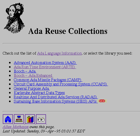 The hierarchical view firsts narrows the search based on implementation language. If the user selects Ada, the Mosaic page shown in Figure 2 appears. This page lists the various collections of Ada software in the FRR; users will find it the fastest way to locate a particular component if they already know which collection it comes from; for example, that they want a component from the Booch-Ada collection.