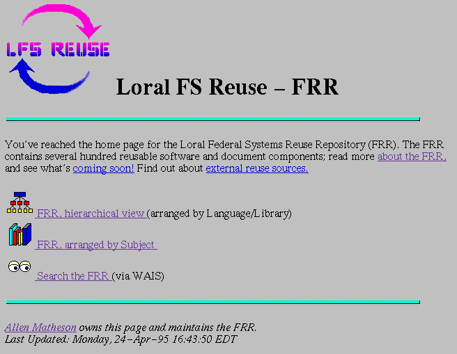 We would like to thank the FRR contractor, Allen Matheson of Cimarron (Houston, TX), for his key role in implementing the Mosaic interface to the FRR. We would like to thank Will Tracz for his valuable guidance and input, Tom Loggia of the LFS Reuse Steering Group for his support, and Gary Kennedy, manager of the Software Engineering department at LFS in Bethesda, MD, from whom the FRR receives its funding.