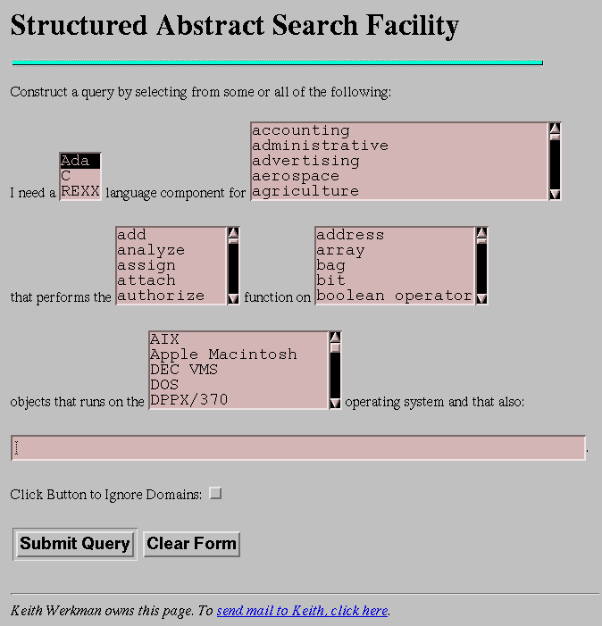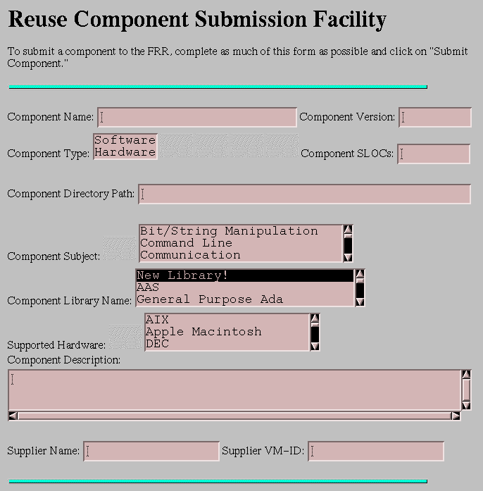 We have implemented the Structured Abstract for component search and component submission. For the initial implementation we combined HyperText Markup Language (HTML) forms and the Common Gateway Interface (CGI) capability of the WWW with Perl scripts to route the selections to a WAIS-indexed database. A couple of points add merit to this approach. First, we continue to require only minimal investment in software and implementation. Second, when we indexed the entire FRR collection using WAIS, we used the formal classification of the original RSL. Therefore, the facets, attributes, and terms used in the HTML forms exactly match those used to index the components with WAIS. This leads to a high degree of exact matches, unlike that of most keyword search mechanisms [Fur87].