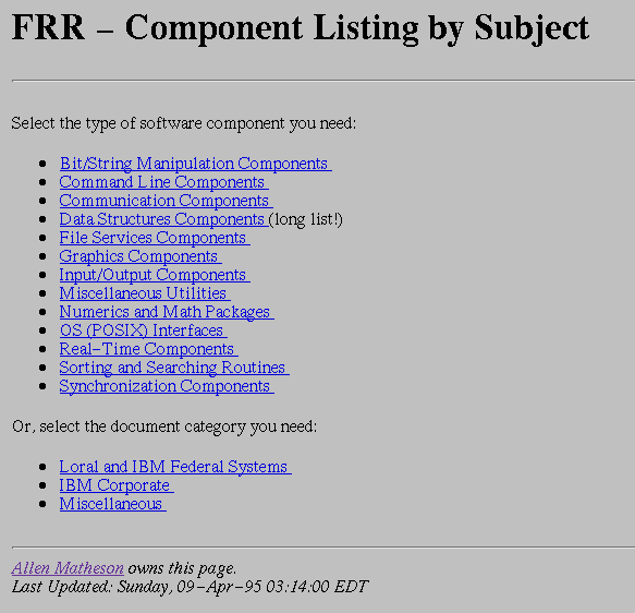 However, a user often does not know (or care) where a component comes from and would rather simply search for components that perform a particular function. The FRR supports this need with the second search option: The FRR, arranged by Subject. Figure 3 shows a portion of the page produced if the user selects this option. For example, if the user needs a monitor or a semaphore, the user would click on Synchronization Components on this component listing.